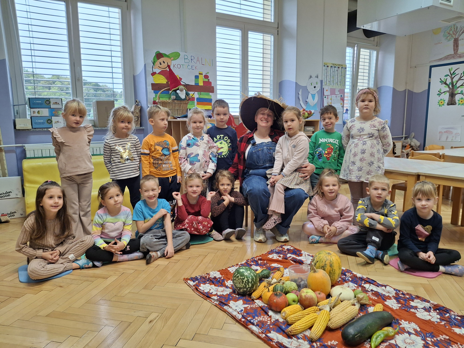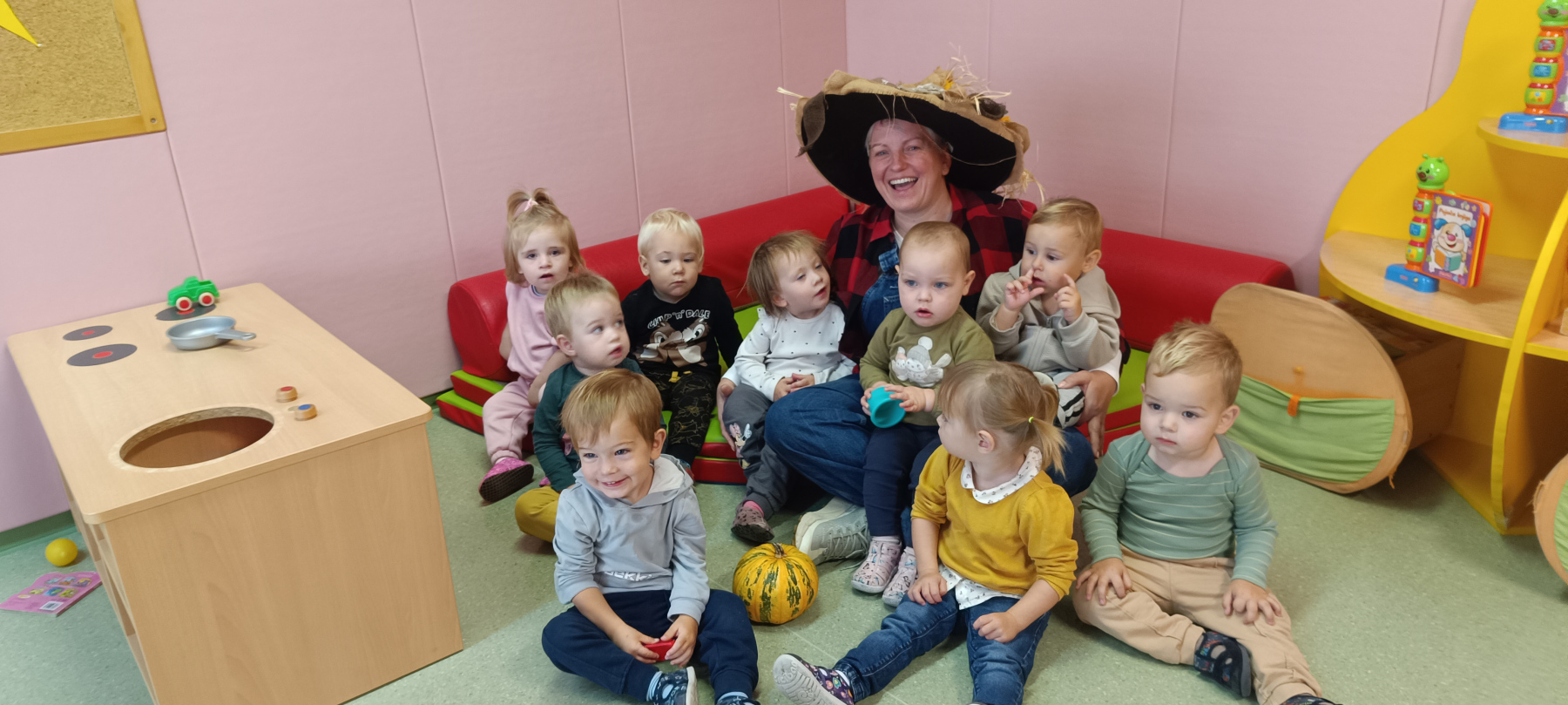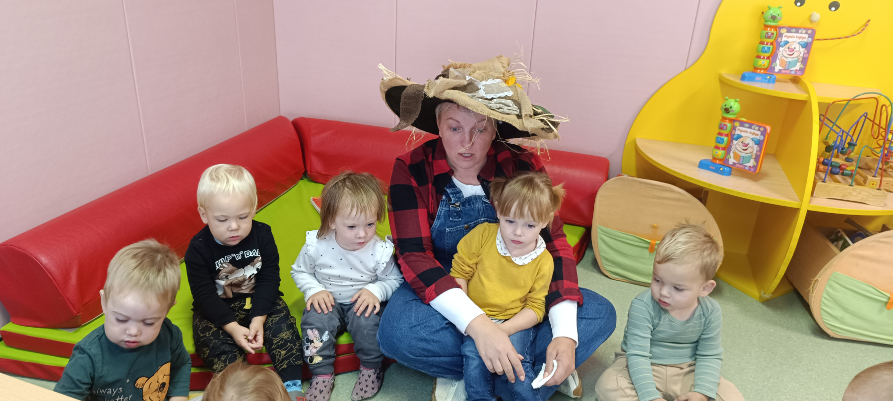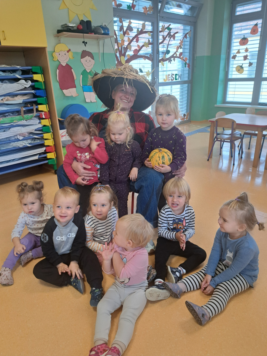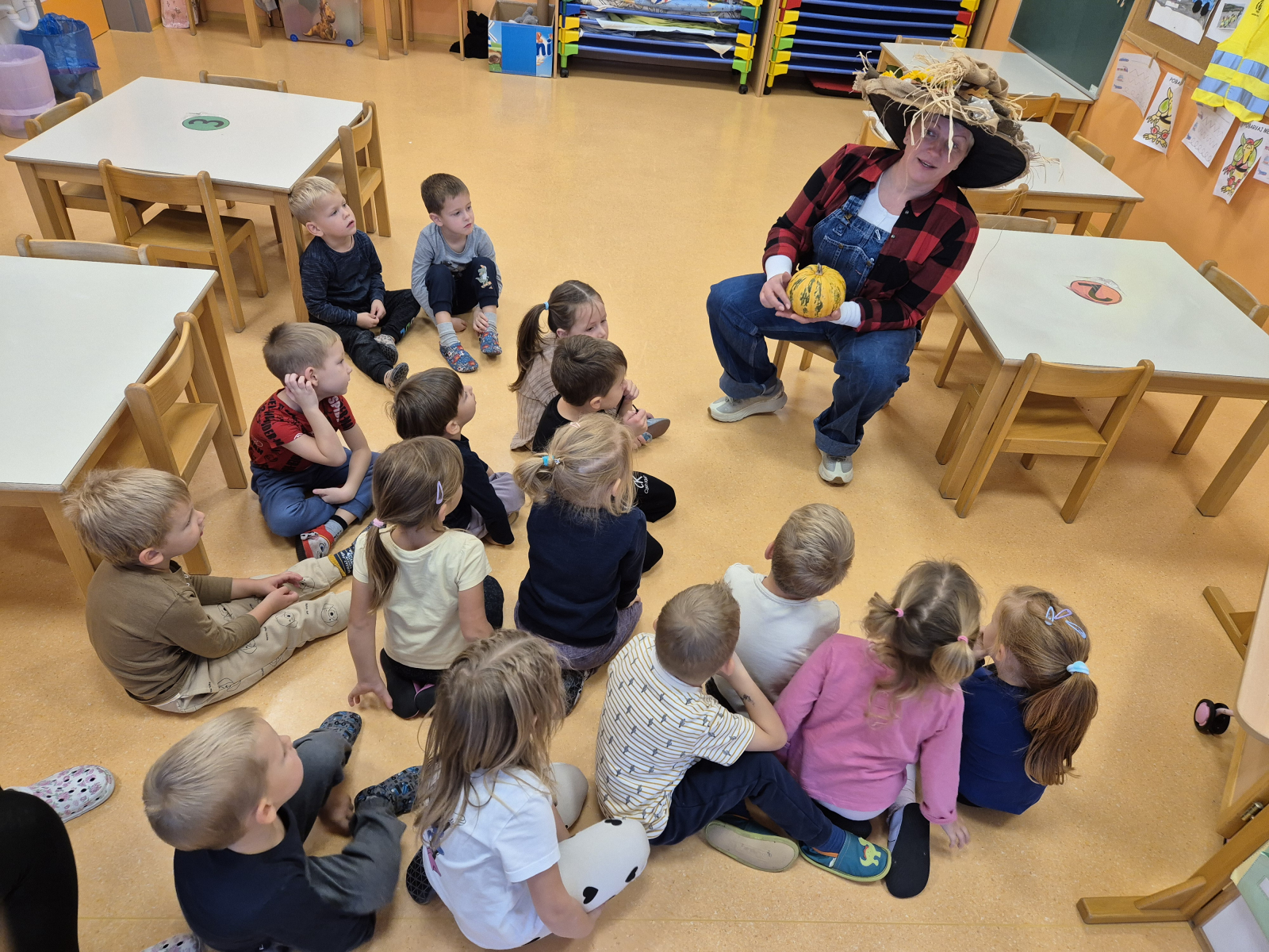 V ponedeljek, 6. 10. 2025, smo v našem vrtcu praznovali začetek Tedna otroka na prav poseben način. Dopoldne nas je v igralnicah obiskalo Strašilo Motovilo, ki je otroke navdušilo s svojo prijaznostjo in zanimivimi pripovedmi o jeseni. Skupaj smo se pogovorili o tem, kaj nam jesen prinese – o pridelkih, pisanih listih in spremembah v naravi.