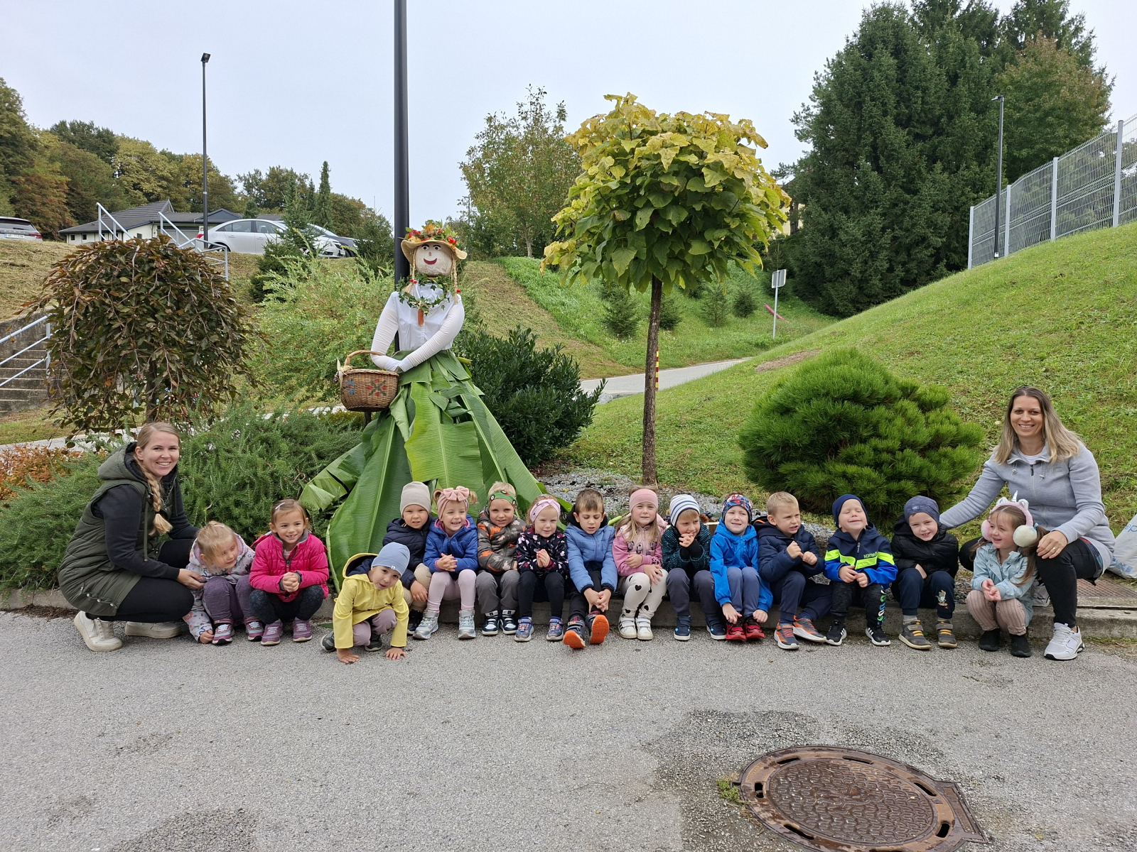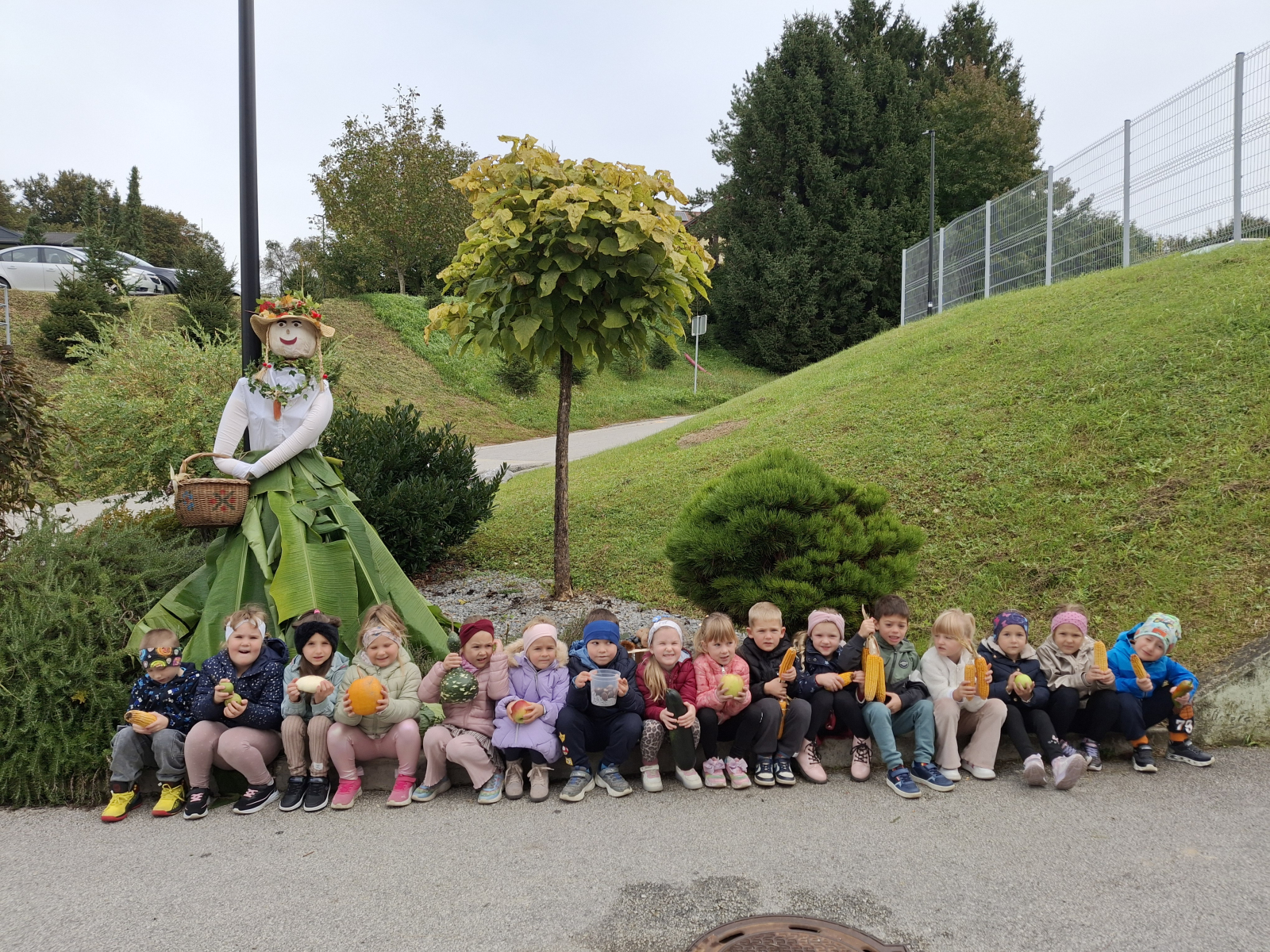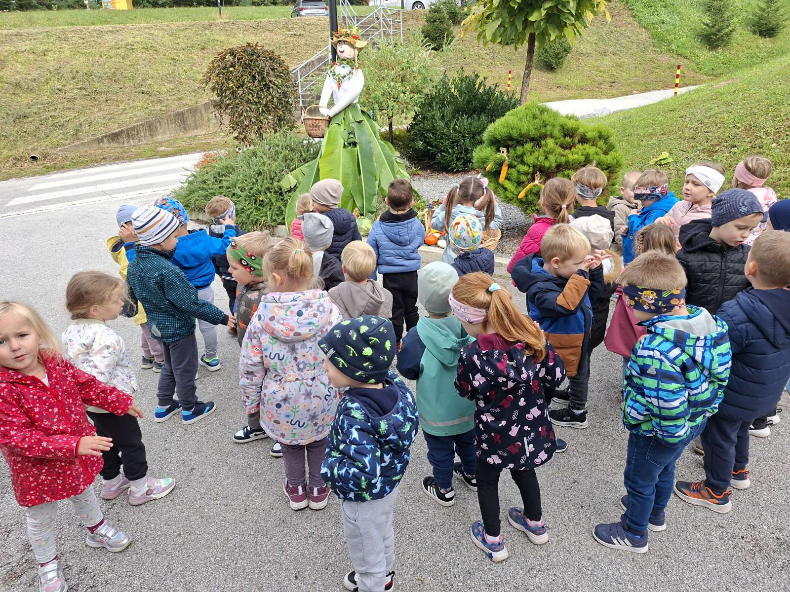 Otroci so nato z veseljem pokazali kaj vse so prinesli v vrtec za Tetko Jesen – jabolka, kostanje, orehe, krompir, koruzo, buče in druge jesenske pridelke. Nato smo se po skupinah odpravili pred vrtec, kjer smo si ogledali Tetko Jesen, ki nas pozdravlja ob prihodu. Zapeli smo ji jesenske pesmi in se fotografirali.