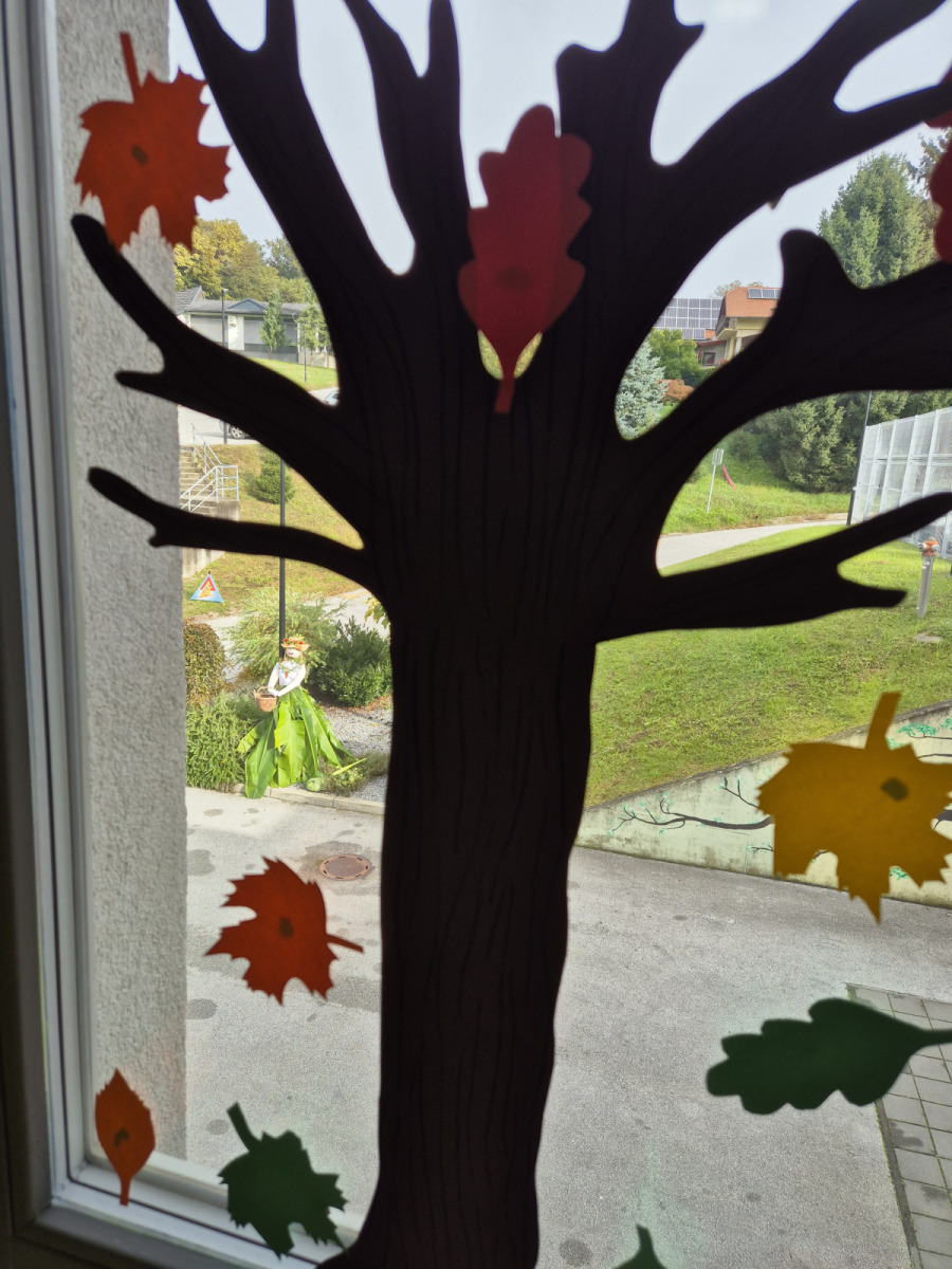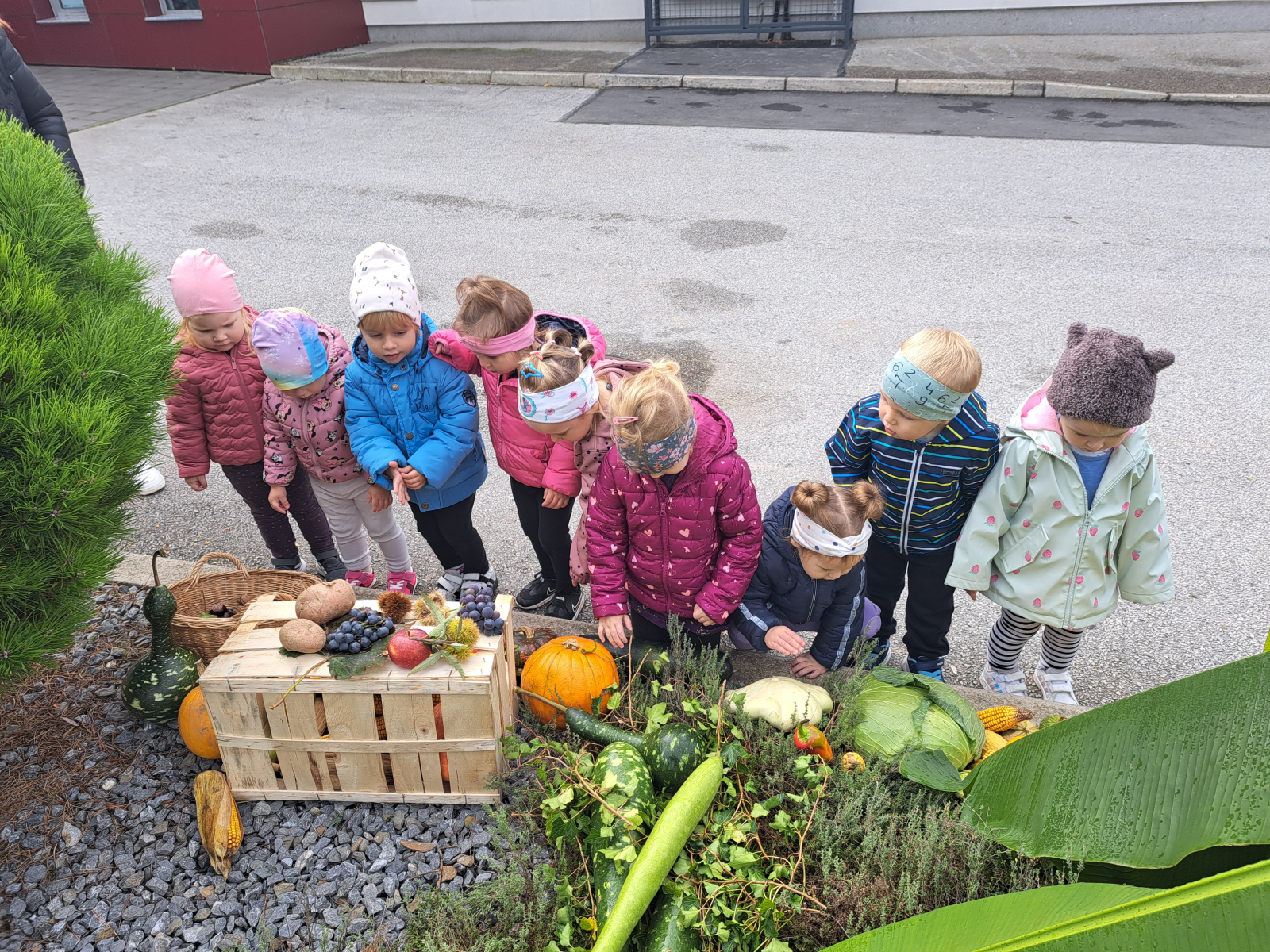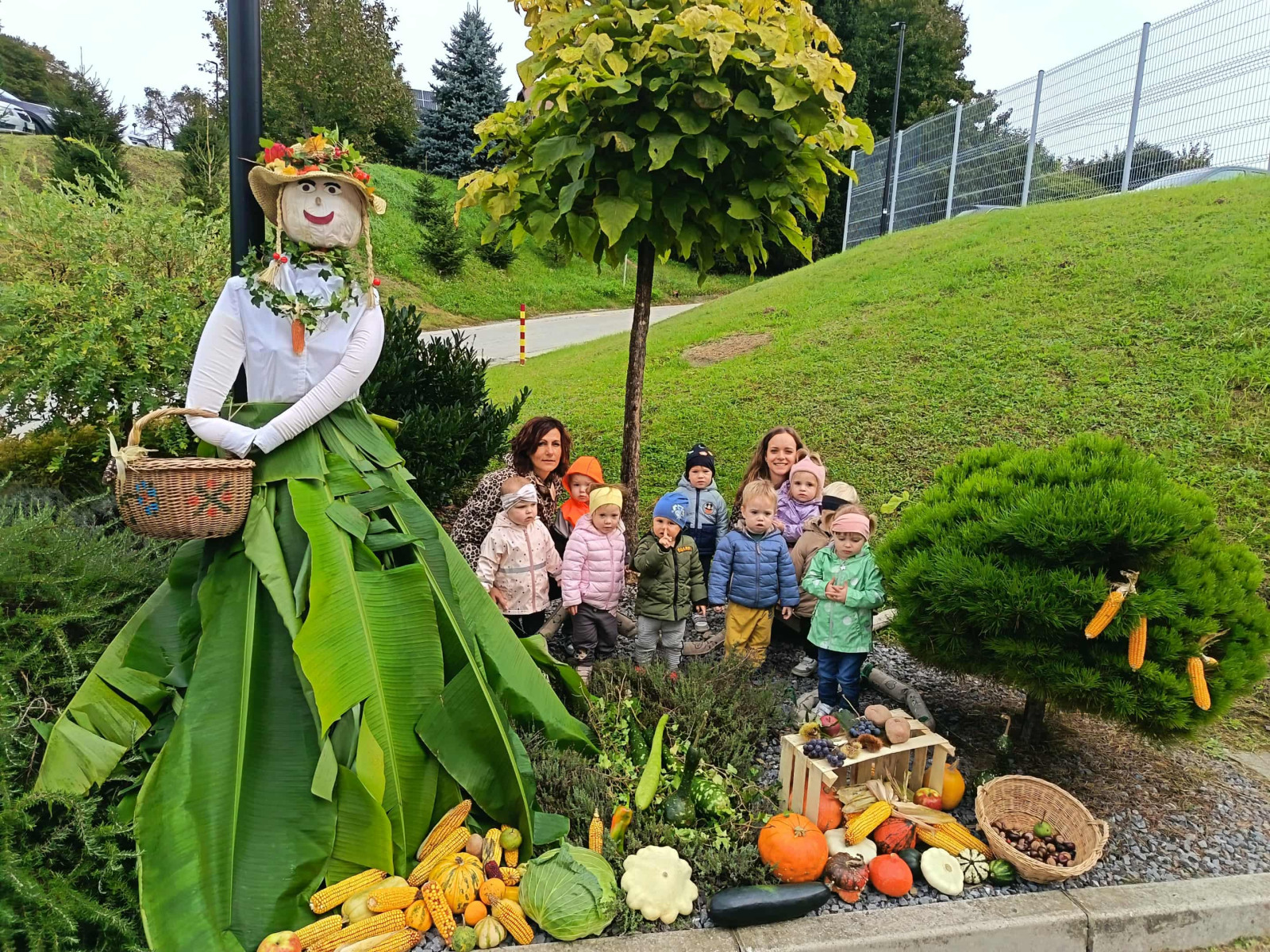 Otroci so nato z veseljem pokazali kaj vse so prinesli v vrtec za Tetko Jesen – jabolka, kostanje, orehe, krompir, koruzo, buče in druge jesenske pridelke. Nato smo se po skupinah odpravili pred vrtec, kjer smo si ogledali Tetko Jesen, ki nas pozdravlja ob prihodu. Zapeli smo ji jesenske pesmi in se fotografirali.