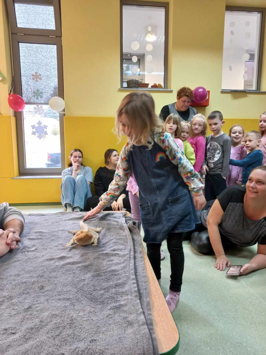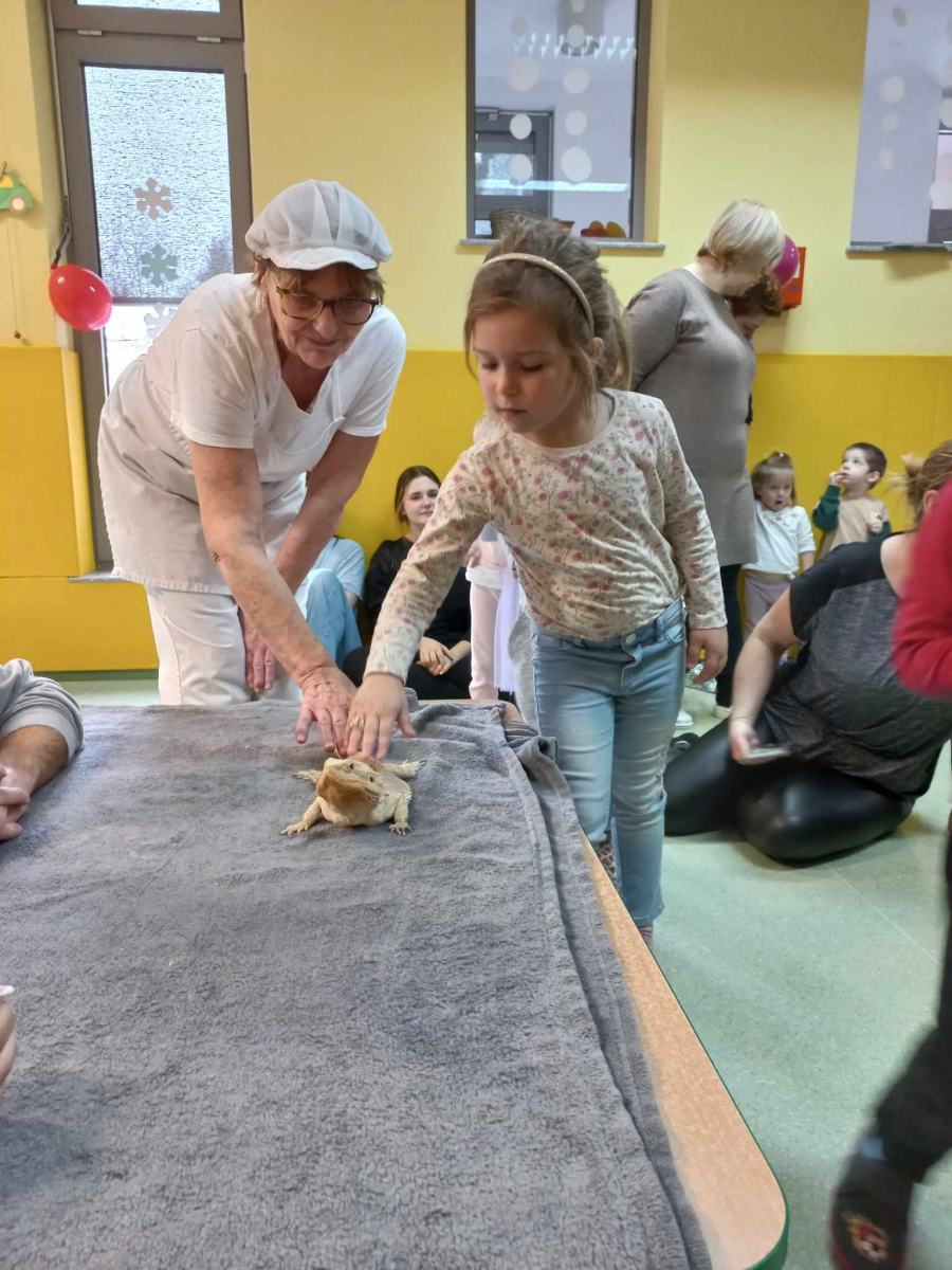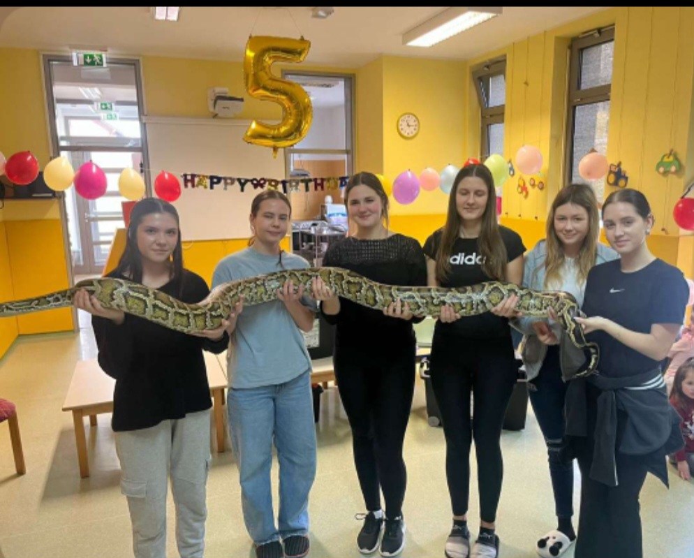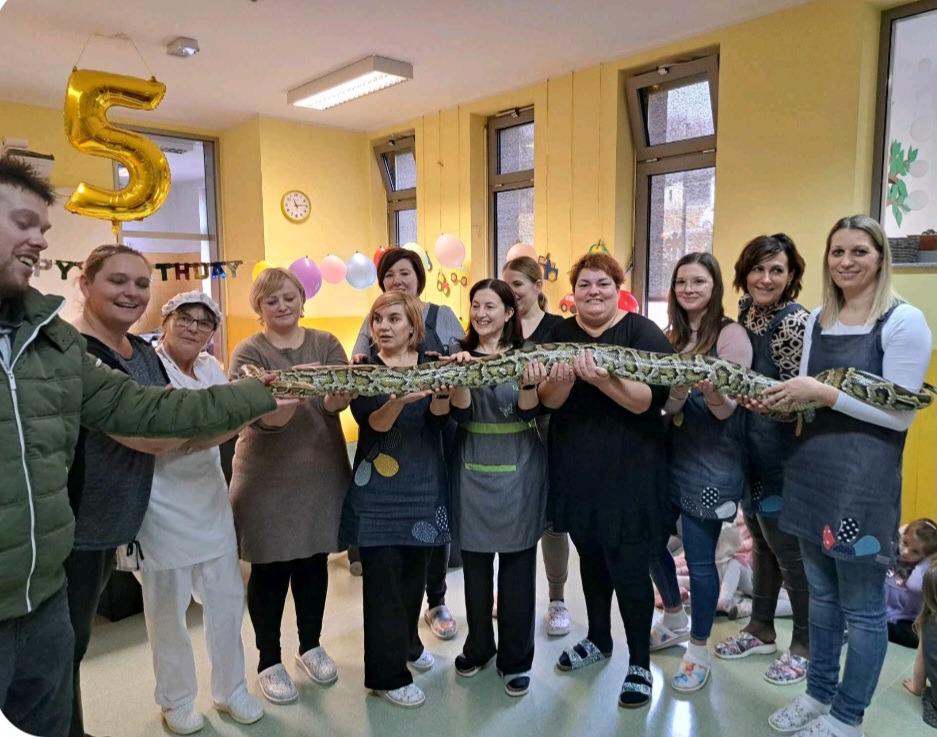 V sklopu praznovanja so v vrtec povabili društvo Pepson’s z eksotičnimi živalmi. Gospod Matej je živali naprej predstavil, nato pa otrokom omogočil, da od blizu spoznajo želve, kuščarje, ščurke, majhnega krokodila in za konec še dve kači. Najpogumnejši so jih celo pobožali in se z njimi fotografirali. Opogumile pa smo se tudi vzgojiteljice in praktikantke ter se fotografirale z veliko kačo.